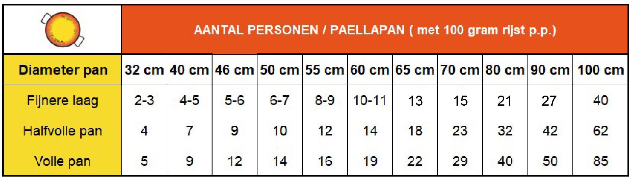 In onderstaand schema staan de richtlijnen zoals opgegeven door de Spaanse fabrikant. Opgelet: niet alle fabrikanten gebruiken dezelfde richtlijnen én recent (in 2024) werden ze door enkele fabrikanten gewijzigd. Kijk daarom altijd naar de afmeting in centimeters als u wil vergelijken met uw huidige pan of met pannen in andere winkels.