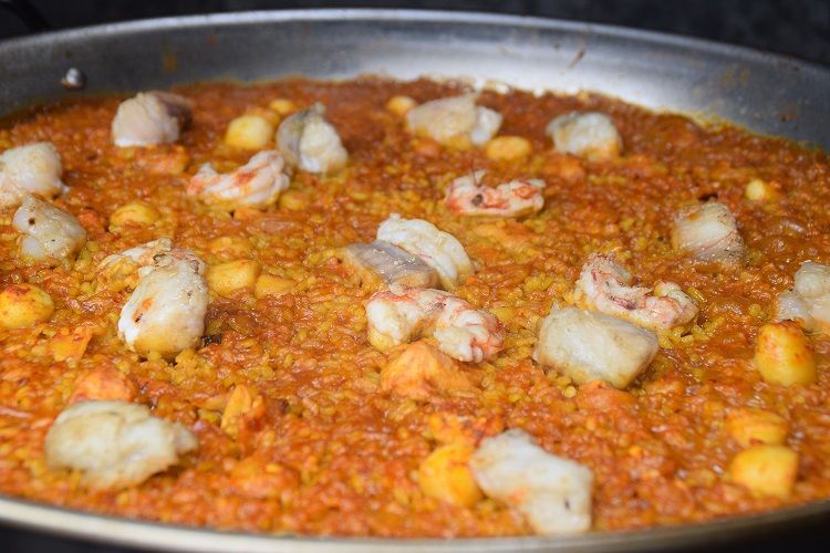 Bij vis wordt best gekozen voor een stevige vis die bij het begin wordt gebakken en dan aan het einde weer toegevoegd. Voor gamba's geldt hetzelfde, bak ze met de schaal en indien mogelijk ook de kop die veel smaak afgeven, en voeg ze aan het einde (al dan niet gepeld) weer toe zodat ze niet uitdrogen. Intktvis wordt heel vaak gebruikt in paella en geeft veel smaak af, net zoals het vocht van mosselen en schelpen. Kreeft of sint-jacobsvruchten zijn feestelijke opties.